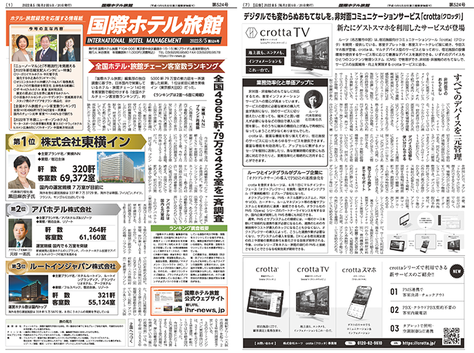 株式会社ルーツ(本社:愛知県名古屋市、代表取締役:石田 真也)が提供する、宿泊事業者向け非対面コミュニケーションツール「crotta(クロッタ)」サービスが国際ホテル旅館新聞(第524号/2022.8.5発行)にて掲載されました。