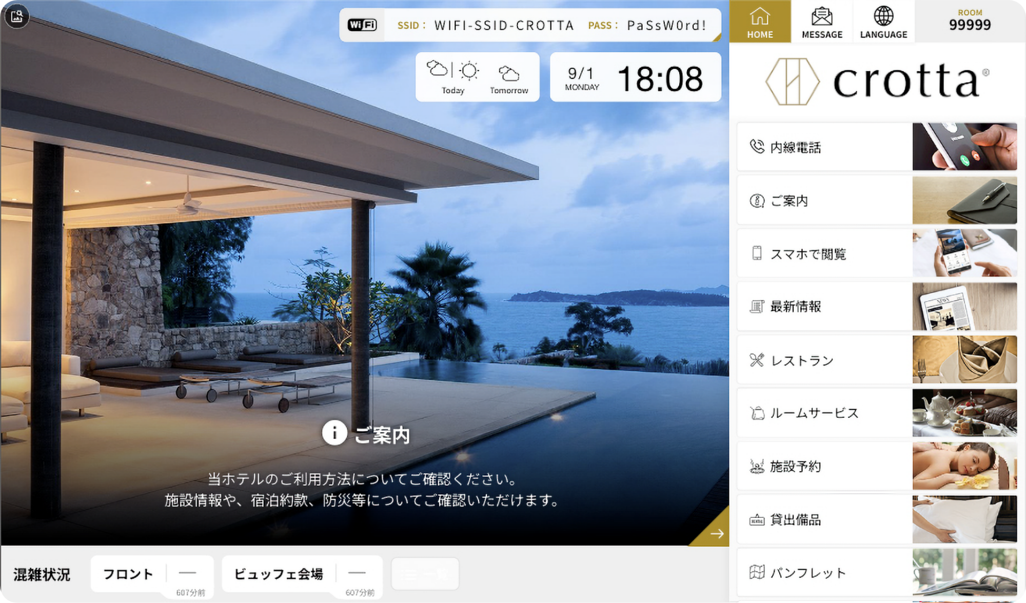 「客室タブレットcrotta」の導入ですべての印刷物がデジタル化されたのですが、印刷コストはもちろんゼロ、清掃もタブレットを拭くだけ、新しい情報も管理画面から登録するだけだし、さらにリアルタイムで発信もできてしまう嬉しいばかりの状況になりました!