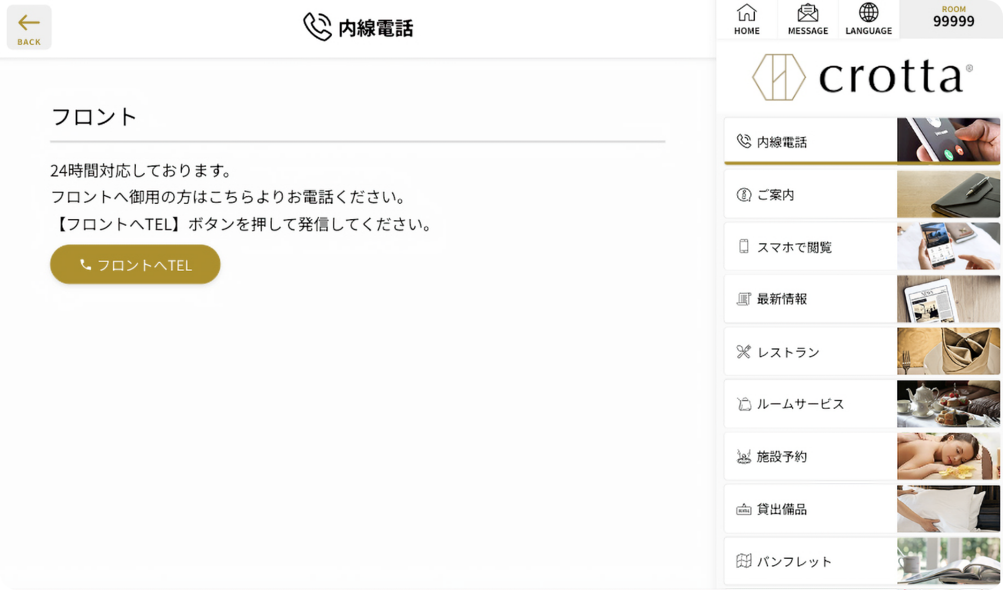 その状況を見かねた総支配人が「客室タブレットcrotta」の導入をしてくれたのですが、すべての情報が多言語で表示される機能があり、管理画面からボタン一つで自動翻訳で登録がされるため、日頃から質問をされる情報をすべて登録をしておきました。そしたらフロントへの問い合わせが激減!チェックイン・アウトの際に質問をされた時も、タブレットを渡して見ていただくことでほとんどの内容は解決できる状態になりました!「客室タブレットcrotta」のおかげで外国語が話せるスタッフがいない日でも安心してフロントに入れます。東京都・シティホテル/300室